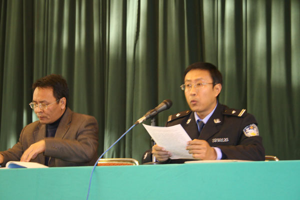报告会由学校教育处主任张光努老师主持,他要求参会班级报告会后,结合我校、本班实际,用主题班会的形式,认真组织讨论,并希望同学们遵纪守法,明辨是非,珍惜青春年华,潜心学习,为自己的终身发展奠定坚实的基础。