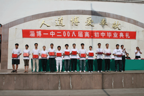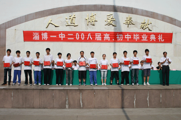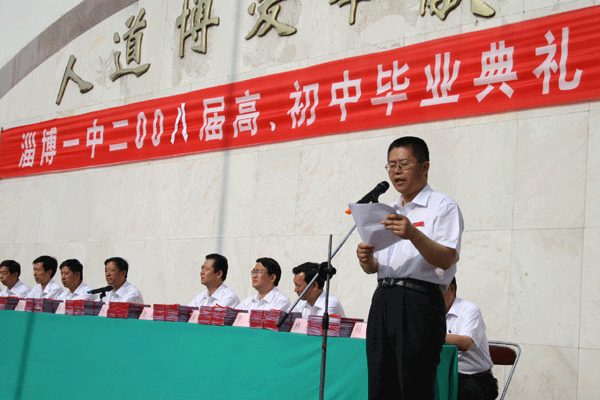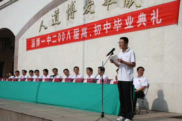 典礼在庄严的《中华人民共和国国歌》声中拉开帷幕,党委书记司志宏发表了热情洋溢的致辞,随后,初四学生代表苏晓塘同学,山东省优秀中学生、高三学生代表冯东明同学,学生家长代表——博山区国税局林红科长和教师代表——文科综合教研室主