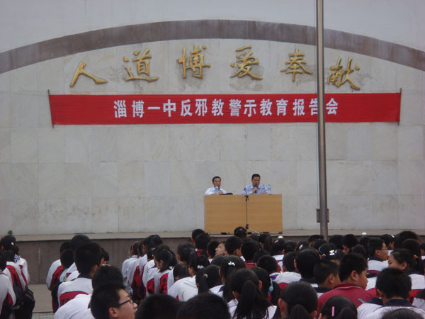 为了进一步提高广大师生对“法轮功”等邪教组织的识别、抵制能力,5月13日下午,我校在博爱广场举办反邪教警示教育报告会。市委610办公室由少华主任、张亮科长,在市教育局组织人事科李效同副科长等的陪同下,来校做专题报告。报告会由校长助理吕永军主持,初中一至三年级1000余名师生听取了报告。