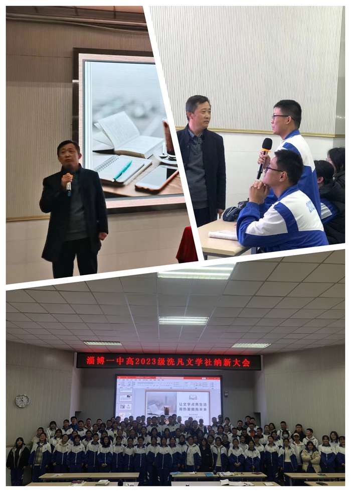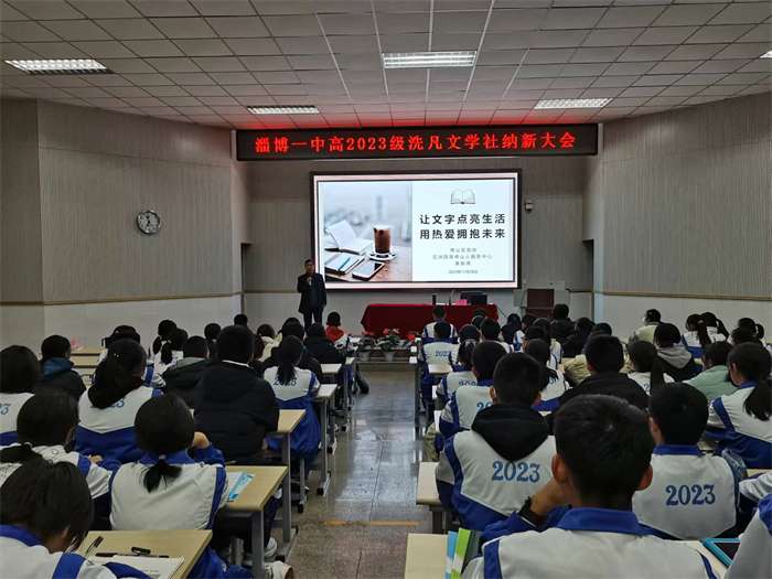 11月28日晚, 淄博一中2023级洗凡文学社纳新大会在课例研究室隆重举行,《五洲四海博山人》编辑部主任董振博,学校党委副书记、校长王波,2023级年级主任樊恒明、语文教研室主任刘可翔、2023级洗凡文学社指导老师以及百余名社团成员参会。