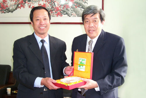 陈贞凯校长向新加坡客人赠送纪念刻盘 |
