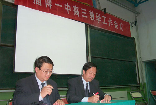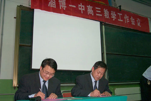 陈贞凯校长与高2003级工作领导小组组长、副校长高雪长签定高考目标责任书 |