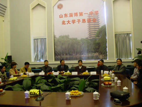出席恳谈会的领导有:北京大学山东招生组组长于念才教授,北京大学正大国际会议中心副主任刘寿安教授,淄博一中校长陈贞凯。淄博一中现在北京大学就读学生赵文发(我校1995级学生,1998年山东省理科状元,经济学研究生)、周磊(我校1995级学生,生物系博士研究生)、李信鹏(我校1998级学生,计算机软件设计研究生)、王昊(我校1997级学生,数学系研究生)、孙婷婷(我校2000级学生,2003年全市理科状元,元培实验班)、栾静(我校2001级学生,2004年全市理科状元,元培实验班)、唐泽远(我校2001级学生,2004年考入北京大学社会学系)、陈铎(我校2002级学生,2005年考入北京大学光华管理学院)、翟晶晶(我校2002级学生,2005年考入北京大学医学部,8年本硕连读)等参加。