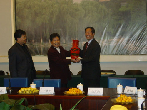 于念才教授首先代表北大招生办公室对淄博一中陈校长一行的到来表示热烈欢迎,对淄博一中多年来关注北大、支持北大、输送优质生源表示衷心感谢。他说,淄博一中是山东省重点中学,首批省级规范化学校,现在正积极创建国家级示范性高中,多年以来始终坚持以人为本,特别是以学生的发展为本,狠抓教育教学质量的全面提高,培养出了一批又一批优秀人才,作为山东老乡,我深感光荣与自豪。同时,他对淄博一中未来发展表达了最美好的祝愿。
