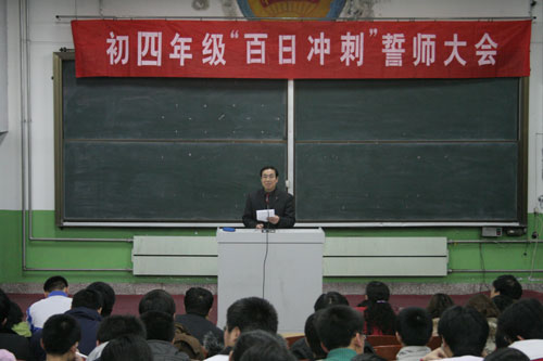 2月27日外语学校“初四年级百日冲刺誓师大会”在西校区阶梯教室隆重举行。淄博市特级教师、政史地教研室主任王方刚老师,“山东省优秀学生”,我校初2001级毕业生王浩哲和初四全体师生参加了这次大会。