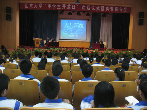 上午10:30分,报告会在学校报告厅举行,会上首先由山东大学党委副书记方宏建致欢迎词,介绍了山东大学的悠久历史和目前的概况,重点向中学生们介绍了山东大学人才培养方面的教育拓展、三种经历、暑期学校、第二次选择专业等创新举措,热情欢迎中学生朋友来山东大学做客,来山东大学参观、学习;接下来,山大外语系学生孔令艺向同学们介绍自己在山东大学学习、生活的经历和感受,最后中国工程院院士王文兴教授作了主题为《人与环境》的科普报告,同学们受到了很好的教育。