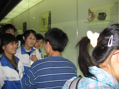 在博物馆,大家不再是校史展厅里那静静的虔诚的状态,几千年的文物激发了他们极大的热情,大家兴奋地不停提问讨论,跟着解说员,生怕漏过了什么重要的解说。突然与几千年时光的旧物重逢,大家问得最多的就是:“这是真的吗?这是那个年代的吗?”青铜器的精美,蛋壳黑陶杯的精致,器形的多样,无不让大家为山东地区几千年前发达的工艺深深折服,在征得博物馆老师的同意和了解注意事项后,他们便迫不及待的举起了自己手中的相机,对山大考古专业的崇敬之情也油然而生。有的同学还围着博物馆的老师了解关于出土发掘等问题。在五楼的书画展厅里,有位同学在蒋维松教授的书画前驻足良久,似乎在思索蒋教授的作品竟有如此高的创意。