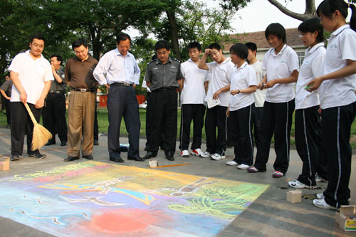 高2005级举办“迎新生”粉笔画比赛 日期:2006-06-02 来源:本站 X 为丰富同学生活,装点校园文化,建设美丽和谐校园,由教育处、高一学生会、团支部联合组织的“迎新生”粉笔画比赛,于5月31日下午在信息图书楼前如期举行。经过两节课的比拼,最终,高一五班、十二班、十一班分获前三名。