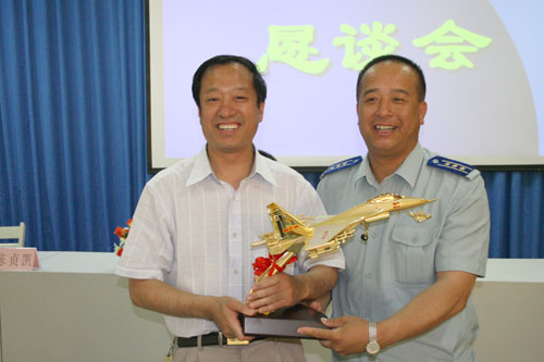 恳谈会前,孙兆福校友向母校赠送了纪念飞机模型,陈贞凯校长向他回赠了纪念刻盘。(任明忠)