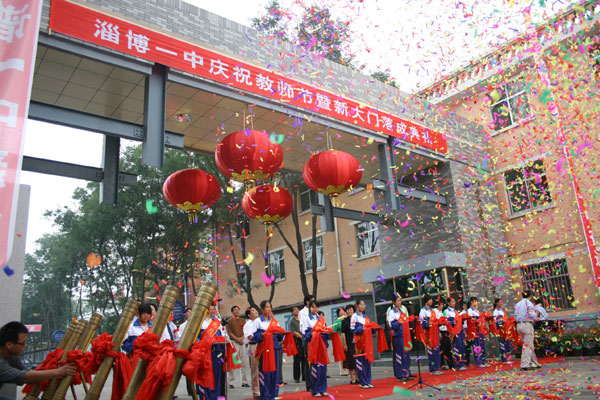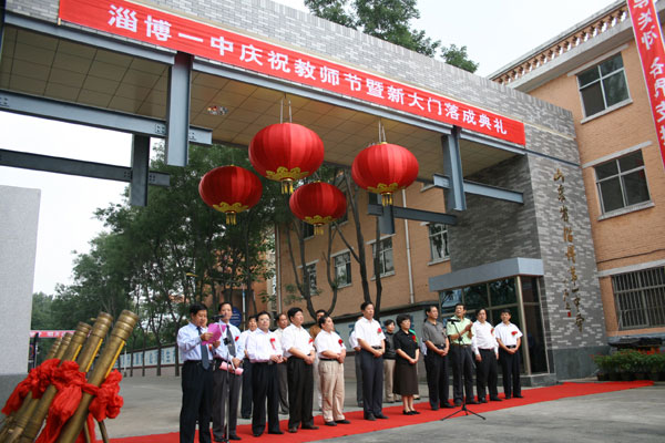 9月8日上午,我校隆重举行庆祝教师节暨新大门落成典礼。市人大常委会副主任关玛莉,市教育局党委副书记刘英学、副局长尹玉法,博山区委常委、宣传部部长韩克新,区人大常委会副主任王文琪、刘持太、张汝震,区政协副主席岳永禧、焦方乾、穆秋萍、杨博等领导出席,副校长张业玉主持会议,校长陈贞凯致欢迎词,近200家市区友好单位前来祝贺。