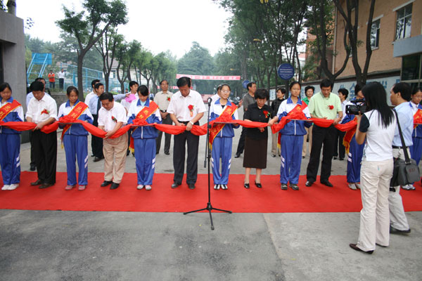 在礼花飞舞,礼炮轰鸣中,市区领导和友好单位代表为学校新大门落成剪彩。