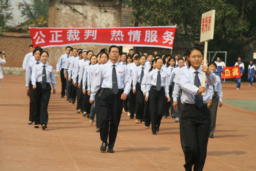 仪式在庄严雄壮的《中华人民共和国国歌》中开始,陈贞凯校长郑重宣布:淄博一中第九届体育节田径运动会开幕!在欢快悠扬的乐曲声里,裁判员和运动员踏着整齐的步伐,喊着响亮的口号,依次进入会场。