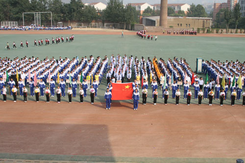 9月28日下午,我校第九届体育节田径运动会开幕式隆重举行,区人大常委会副主任张荣孔,区政协副主席岳永禧,区广电局局长王新生,区文明办主任李安臣,区委宣传部副部长程涛,区文化局副局长李同福,区电视台台长郭平,博山六中校长李效荣,博山七中校长张建国等领导和我校校级班子成员、离退休老同志代表在主席台就座,艺体处主任赵玉明主持开幕式。