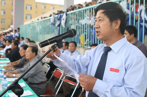 张业玉副校长致开幕辞,他指出,举办体育节是落实我校“以教学为中心,将德育置首位,打好五育基础,注重因材施教,努力改革创新,培养四有人才”的办学宗旨,对学生进行集体主义教育和意志品格教育,充分展现我校体育运动水平的重大活动。多年以来,我校的体育工作一直走在全市乃至全省的前列,是山东省体育传统项目学校。他希望全体裁判员、工作人员要明确责任,严守职责,公正裁判,热心服务,为运动员搭建充分展示体育才能的舞台;全体运动员要珍惜这次很好的比赛锻炼机会,积极参与竞争,培养顽强品质,力争一流成绩;全体师生要高度重视安全,把安全工作放在各项工作的首位去考虑,杜绝各种不安全现象的发生。