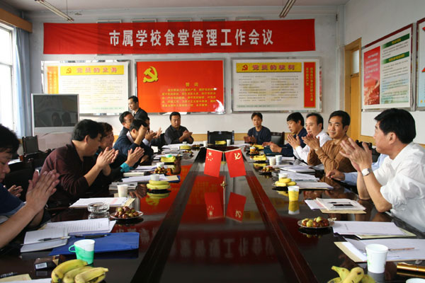 10月12日,市属学校食堂管理工作会议在我校举行,市属各学校分管领导参加了会议。市教育服务中心刘德堂书记主持会议并作重要讲话,传达了上级部门和各级领导关于加强饮食卫生安全工作的指示精神,并提出贯彻落实意见;市教育服务中心王传道科长部署下一段工作;淄博一中、淄博实验中学、淄博五中、淄博四中等单位分别汇报介绍了食堂管理工作。与会领导实地参观考察了我校食堂管理经营情况,在肯定工作的同时提出了指导意见。