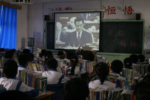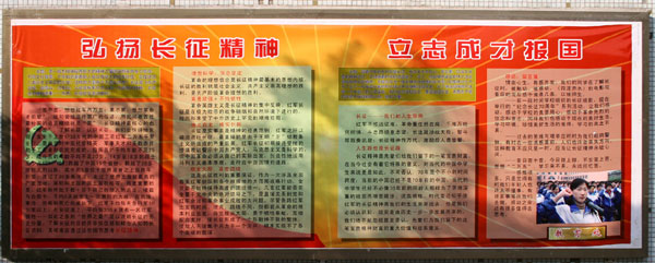 为纪念长征胜利七十周年,使学生铭记中国工农红军的这段辉煌历史,让学生感受当年红军老前辈为争取今天的幸福生活所付出的艰辛,时刻激励同学们不断的奋进,让民族精神世代永传,高2006级举行“纪念长征70周年”系列活动:周一, 利用下午第四节班会,先收看胡锦涛总书记“纪念长征70周年”讲话。然后结合胡书记的讲话内容、长征故事材料,以“弘扬长征精神,立志成才报国 ”为主题展开讨论;周二,以“革命理想高于天”为主题进行优秀黑板报评选,共评出一等奖6名,二等奖10名;周三,观看了长征影片《四渡赤水》,并进行了以“长征让我懂得……”为题的征文活动,对评出的优秀征文通过展板进行了展出。
