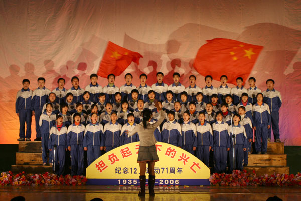 为纪念“一二·九”运动71周年,根据学校第十八届艺术节整体活动安排,12月9日,学校团委会、艺体处和高2006级领导小组组织高2006级全体学生在校本部体育馆举行了“担负起天下的兴亡”主题合唱比赛。