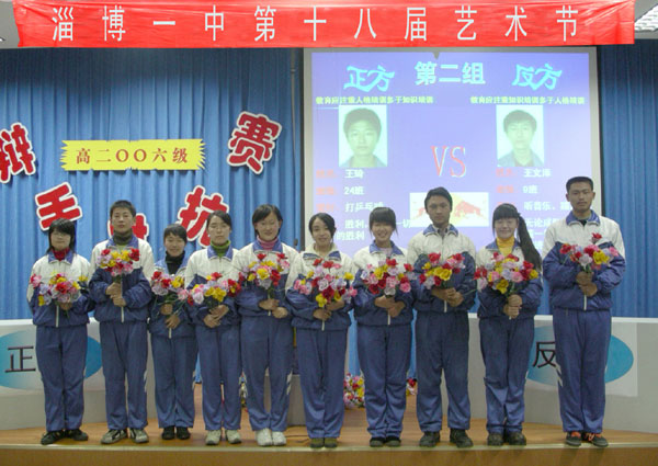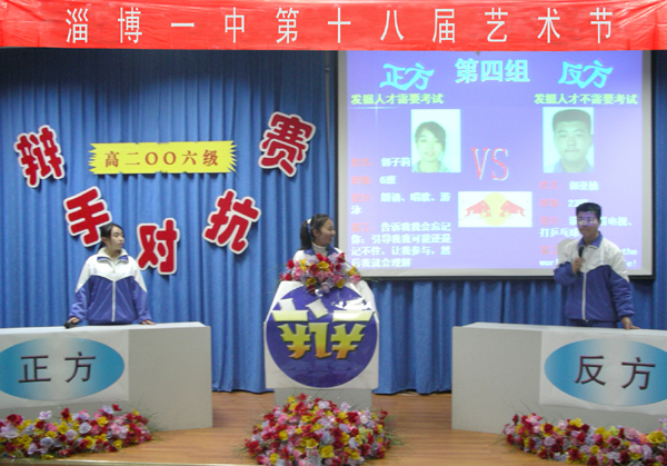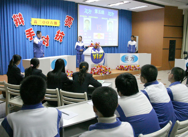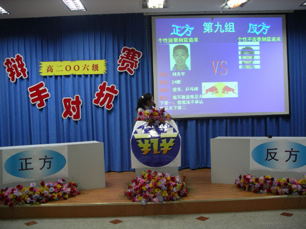 为培养学生的思辩能力,筹建辩手协会,根据学校第十八届艺术节整体活动安排,12月17日,学校教育处、团委会、文综教研室和高2006级领导小组联合组织了“激扬青春,放飞梦想”主题辩手对抗赛。