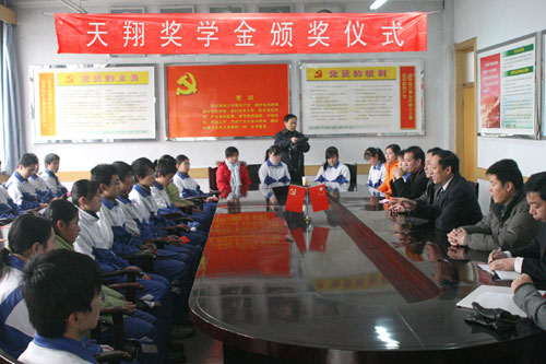 1月25日,“天祥奖学金”颁发仪式在学校党员活动室举行。学校爱心基金会名誉会长、原博山区人民检察院逯检察长、博山天威集团天祥公司赵经理、袁经理,学校陈贞凯校长、徐继华副校长、招生办赵玉明主任出席仪式。