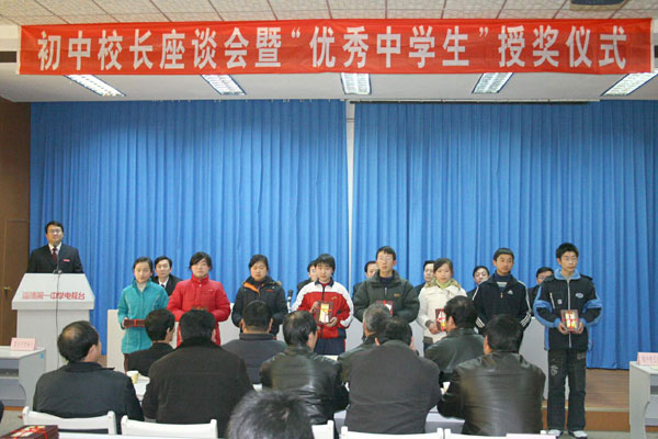 1月3日,博山区初中校长座谈会暨淄博一中2006年度"优秀中学生奖学金"颁奖仪式在我校科技报告厅举行。参加本次大会的有各初中学校校长及获奖学生、区教育局领导、我校领导班子成员及部分名师代表,副校长高雪长主持了会议。