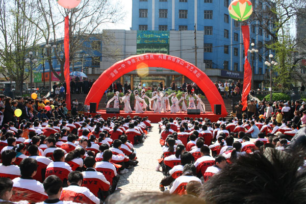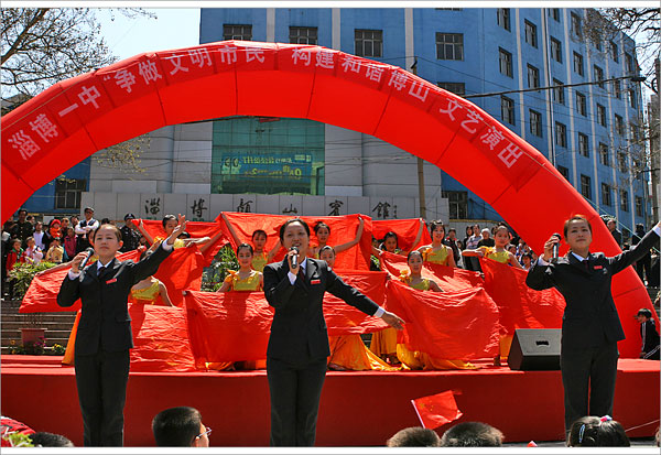文艺演出于10时拉开帷幕,淄博一中艺术团的师生载歌载舞,向广大市民献上了一台异彩纷呈的节目。群舞《溜溜的康定溜溜的情》舒展出了西域高原的柔美,古筝独奏《春到湘江》浸润出了南国山水的优雅,女声三重唱《欢天喜地》抒发出了共奔小康的豪情。外籍教师教唱英文歌,武术队员挥舞刀枪剑戟,优秀校友倾情献歌。一曲曲“心歌”,一节节“心舞”,不时赢来场内观众的阵阵掌声。最后一曲《和谐中国》,更是大气磅礴,催人奋进,将宣传活动推向高潮。