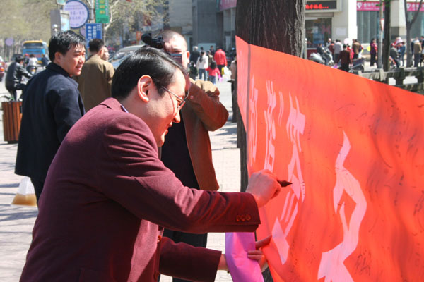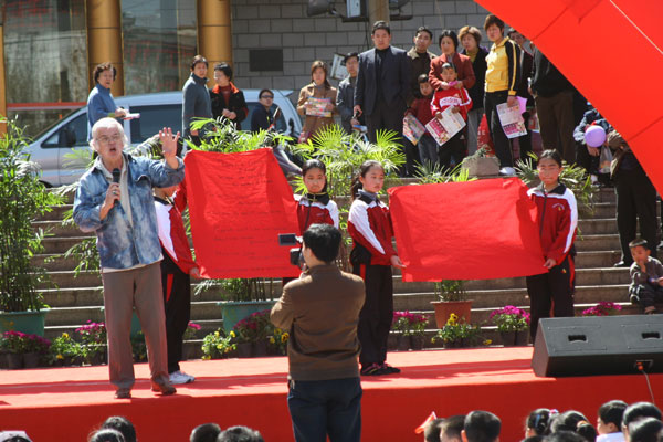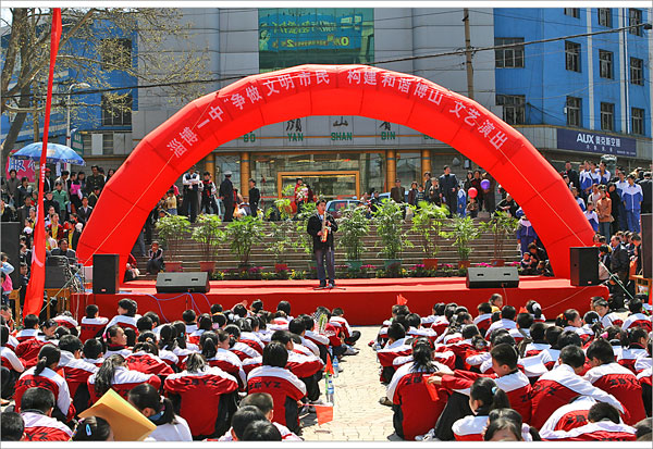 上午9时,广场上锣鼓声声,彩旗猎猎,人山人海,将“淄博一中‘争做文明市民、构建和谐博山’文艺演出”的大型彩门和“尽职尽责办好学校、全心全意培育人才”的竖幅标语映衬得更加红红火火,鼓舞人心。着装整齐的教师和同学把一张张倡议书散发到人们手中,年过古稀的长者、风华正茂的青年、活泼可爱的少儿纷纷在“争做文明市民、构建和谐博山”条幅上庄重地签下了自己的名字,“从我做起,从现在做起,从小事做起,争做文明市民,做和谐博山的先行者、建设者、传播者、监督者,手拉手谱写辉煌的乐章”成为博山人共同的心声。