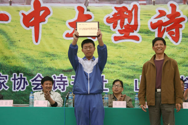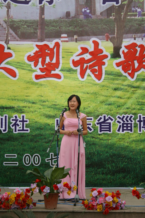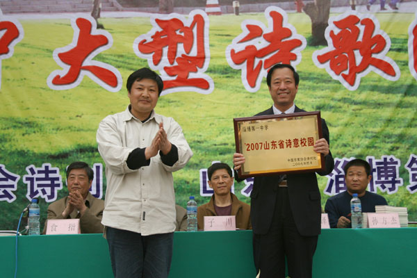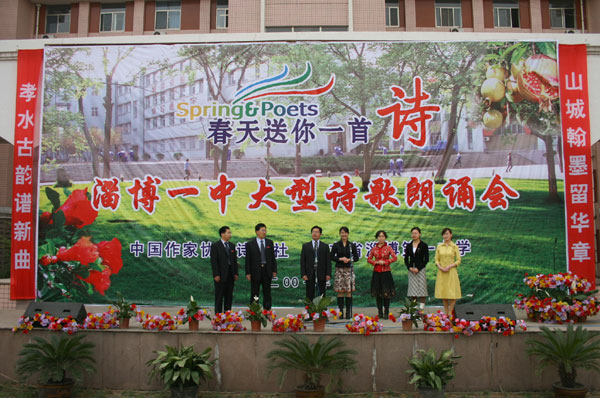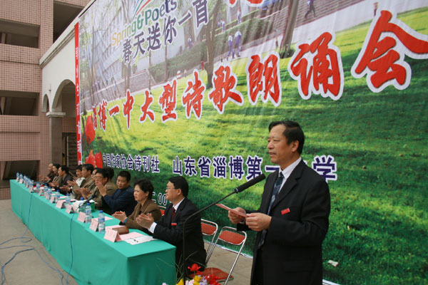开幕式上,首先由陈贞凯校长致词,代表学校对各位来宾和领导的光临表示欢迎,对中国《诗刊》杂志社“春天送你一首诗”大型诗歌朗诵会在我校召开表示祝贺,并衷心希望诗歌朗诵会取得圆满成功。中国作家协会诗刊社、著名诗人蓝野为淄博一中颁发2007山东省诗意校园奖牌,他在讲话中对淄博一中深厚的文化底蕴和优良的传统承继给予高度褒奖,倡议全体学生做一个拥有纯净心灵的诗人,享受春天的阳光,接受诗歌的滋润,用美妙的诗歌表达内心欢快的感言,让生命拥有一抹鲜艳的绿色。扬子江诗刊副主编子川为淄博一中洗凡文学社颁发了山东省高中校园优秀文学社团奖牌。著名诗人王夫刚为淄博一中高2006级25班孙文颖同学颁发了山东省高中校园优秀文学作品奖证书。著名诗人孙方杰向淄博一中广大诗歌爱好者赠送了《《山东省青年诗选》和《山东省高中文学社团优秀作品集》。