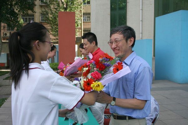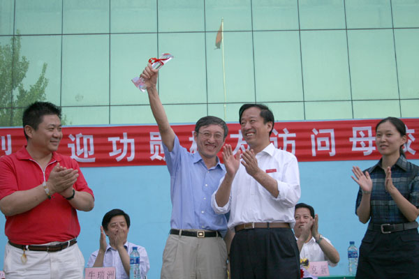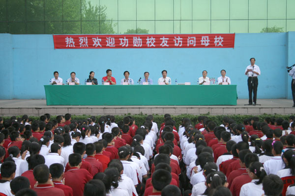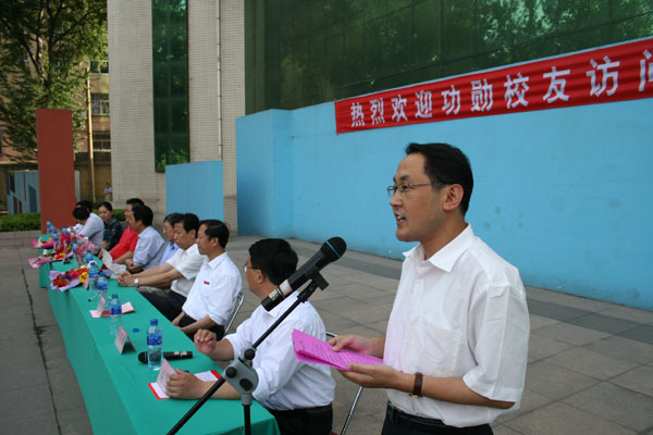 陈贞凯校长在致辞中,首先代表学校向荣归母校的三位校友表示热烈欢迎!向出席大会的领导表示衷心感谢!他指出,建校83年来,六万余名一中校友遍布世界各地、各行各业,涌现出了一批又一批的学术专家、兴业英才和治国栋梁,为国家和社会做出了贡献,为母校争得了荣誉。广大校友,尤其是众多著名、知名校友的奋斗成长历程,是学校宝贵的精神财富和文化资源。为充分发挥校友这笔珍贵资源的作用,学校于2005年6月开始实施“校友母校行”系列活动计划,邀请知名校友回母校访问,与师生见面,举办各种报告会、座谈会,以此激励在校学生,促进学校发展。同时设立“功勋校友”荣誉杯,对事业上取得优异成绩、为母校做出突出贡献的校友授予“淄博一中功勋校友”荣誉称号。在此之前,已有10位校友已获得“功勋校友”称号,他们是:清华大学教授崔京浩,北京邮电大学教授李玲,原山东工程学院党委书记、研究员张福信,原新华社青岛支社社长、高级记者张荣大,淄博晚报社副总编辑、高级记者田岚,国家电影局副局长、国家一级作家张宏森,原外交部亚洲司副司长、驻印度特命全权大使周刚,著名男高音歌唱家吴雁泽,中央电视台著名节目主持人曲向东,著名男高音歌唱家曹连生。