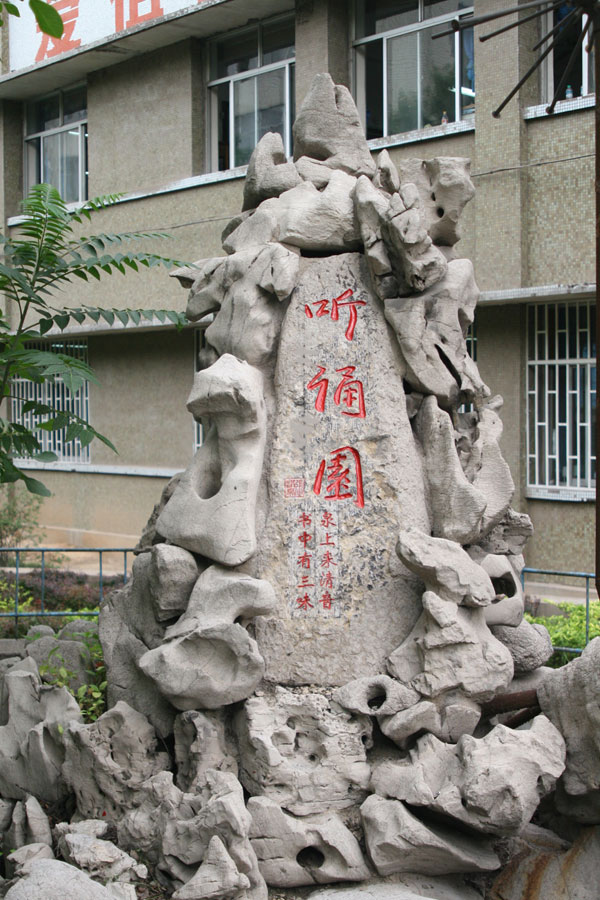 石榴园,附以《石榴园小记》:孝水古韵,翰墨华章;曲径通幽,石榴书香;人杰地灵,教学相长;厚德载物,君子自强。使人在细细品味中产生不尽的联想,引发对淄博一中文明资源的思考与探究。琅琅书声飘窗外,幽幽芳香醉百花,听诵园可谓天成之名,附以“泉上来清音,书中有三味”,身临其境让人顿生如处世外桃源之感。《史记·李将军列传》有言:桃李不言,下自成蹊。桃李园承载了默默耕耘的广大园丁“真情大爱育桃李,春华秋实写人生”的宽厚襟怀,寄托了莘莘学子“今天我以淄博一中为荣,明天淄博一中以我为荣”的美好追求。士子园,栽植着校友们和在校学子们对母校这方沃土的深切感念与眷恋,“十年树木,百年树人”提醒着每一个一中人时刻不忘求学养心,争做社会栋梁之材。未知园,犹如一本无字之书,启迪着富于求知欲望的学子博览大千世界,畅游知识海洋。