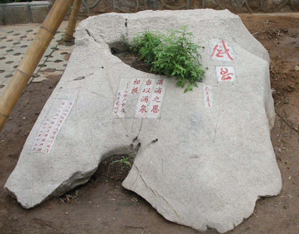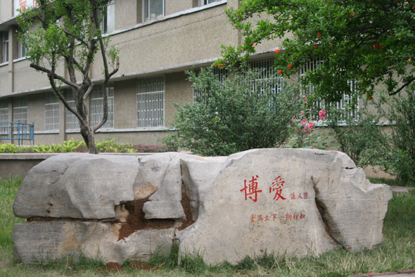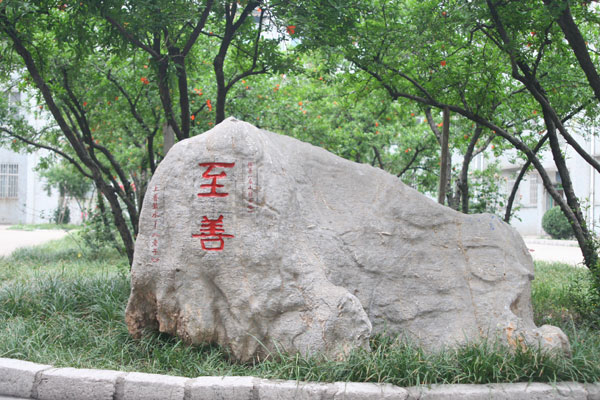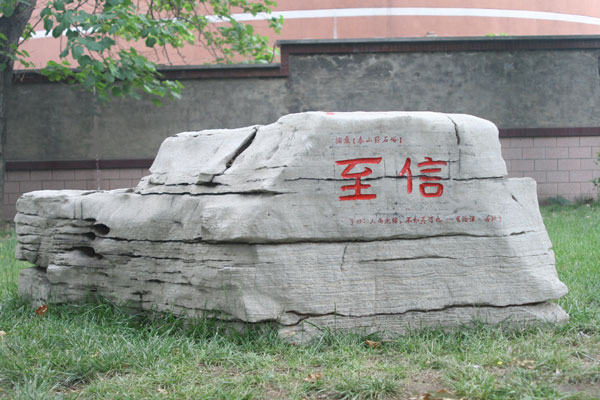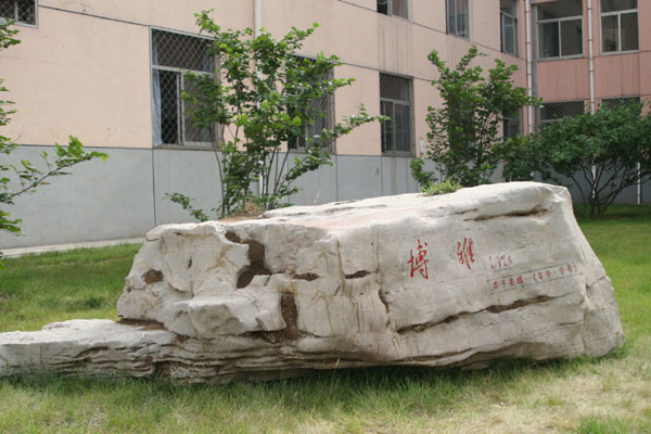 景观石刻孙中山先生题写的博爱,附以陶行知先生倡导的“爱满天下”;毛泽东主席书写的博雅,附以“君子安雅(《荀子·荣辱》)”;周恩来总理书写的感恩, 附以“ 涓滴之恩,当以涌泉相报(《增广贤文·朱子家训》)”;摘录于【泰山经石峪】的至善,附以“上善若水(《老子》)” ;摘录于【泰山经石峪】的至信,附以“子曰:人而无信,不知其可也(《论语·为政》)” ,彰显着学校永恒的育人主题。这些景观、石刻、标牌,结为淄博一中校园别具一格的德育读本。