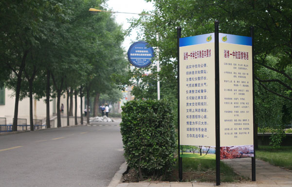 按照学校九届二次教代会制定的《全面构建学校文化,整体提升办学品位的意见》,落实学校计划要求,今学期以来,我校精心塑造校园文化载体,完善校园文化体系,截至目前,已充实完成了10处文化景观的建设,其中包括石榴园、听诵园、桃李园、士子园、未知园等5处文化园区和 “博爱”、“博雅”、“感恩”、“至善”、“至信” 等5尊景观石刻,与同步设立完成的校园主要干道命名标示牌、校园文明启示牌共同构成一道透着浓浓文化气息的风景线。