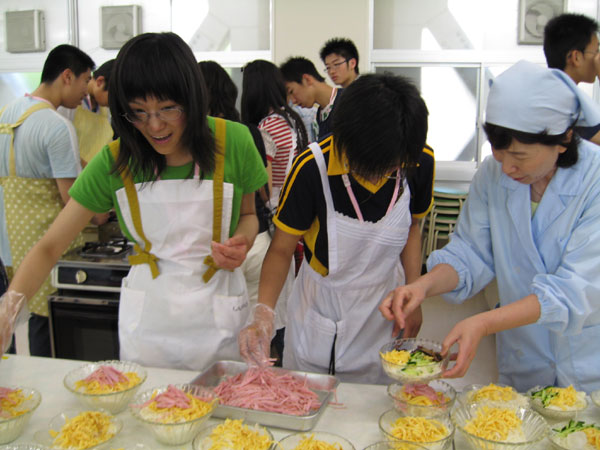 在广岛的另一项重要活动就是访问广高中和民宿。广高中是吴市的一所普通高中学校,与日本的大多数学校一样,规模也不大,只有5百多名学生,我们中国的学校有的学生达数千人,这在日本是不可想像的。广高中学生都是就近入学,升学率很高,各类课外活动也搞得很好。学校的师生分别为我们表演了剑玉、古琴演奏,中午与学生们一起做日式凉面。这是学校开设的烹饪选修课。大家各显身手,分工合作,中午就吃自做的凉面。下午参观学校剑道课让大家吃惊不小,一进体育馆,就听到声嘶力竭的叫喊声,几十个剑道队员正手持竹制的长剑,一对一交战在一起。他们戴着头盔,赤脚,全身裹得严严实实,每做一个动作都伴随着令人不寒而栗的喊声。那是一种置身死地的绝望的喊声,只这一声,就足以让对手精神崩溃,看得我们身上一阵阵发冷。除去防护套,眼前的队员一个个也是文静温和的学生,并非是我们想像的个个面目狰狞。据介绍,剑道在日本很盛行,几乎每所高中都有剑道课。我想,也许一个民族的强大就需要这种居安思危的教育吧。