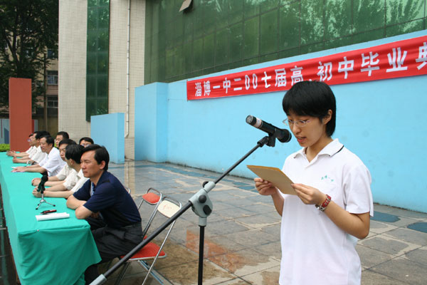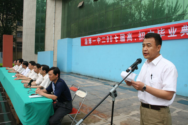 在向圆满完成了高、初中学业的毕业生表示热烈祝贺,向辛勤工作的老师表示衷心感谢之后,陈校长指出,在淄博一中这所有着83年光荣历史的校园里,在"治学严谨、学习扎实、生活丰富、文明充盈" 的校风熏陶下,在老师们的耐心指导下,你们懂得了做人的道理,提高了自理的能力,掌握了学习的方法,养成了良好的习惯。你们中很多同学抱负远大,追求真理、渴求进步,有近700名同学向党组织递交了入党申请书,周文静等10余名同学被评为省、市级三好学生、优秀学生干部。成果的取得,凝聚着老师的汗水、家长们的爱心,更凝聚着同学们的勤奋和努力。