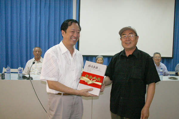 陈贞凯校长代表全校师生对他们表示热烈欢迎,介绍了学校近况,表达了美好的祝福。老同学向母校赠送了自己编辑的全班同学相册《风雨里程——淄博一中初十四级一班五十年同学情缘纪念》和带有同学签名、班主任刘爱华老师1959年所画的两个朝气蓬勃少先队的挂图。