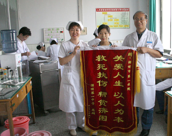 9月21日下午,淄博市第一医院消化内科办公室里,一位少女双手捧着一面锦旗来到主治医生谢大夫和护士们面前,“谢谢好心的医生、好心的护士,谢谢医院的叔叔、阿姨,如果没有你们,我不知道我的病会怎样……”话还没说完,女孩已经泪流满面,泣不成声。