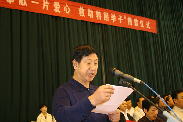 张业玉副校长在讲话中向各位爱心联谊会成员的高尚义举表示诚挚的感谢!他指出,我校于1999年1月成立了全市学校首家“爱心基金会”,其宗旨是:扶助品学兼优的特困学生,帮助他们摆脱困境度过难关,激励他们发愤读书,学有所成,成就理想。口号是:“奉献一片爱心,托起明天的希望”。为此制订了《淄博一中爱心基金会章程》,建立了系统的工作机构和完善的工作制度。《章程》规定:于每年的3月、9月分别举行集中捐款仪式,学校全体教职工和学生自愿捐款,学校积极为基金会注入资金,吸收社会捐款;专帐管理,专款专用。截止今年上学期,爱心基金会已举行了16次集中捐款仪式,教职工捐款累计20.5万元,学生捐款13.7万元,学校行政注入97万元,社会人士、校友捐款68万余元;共资助特困生和减免学费4600多人,累计支出资助金198.5余万元。他希望接受资助的同学一定要倍加珍惜全校师生、社会各界用爱心凝结的深厚情谊,倍加珍惜来之不易的学习条件,在人生的旅途上,以爱心为伴,与奉献为友,顽强进取,成就理想,把感恩作为动力,以应有的品德和行为帮助他人,回馈社会。