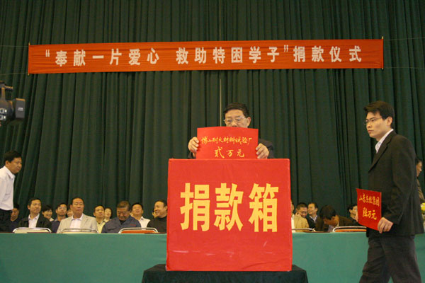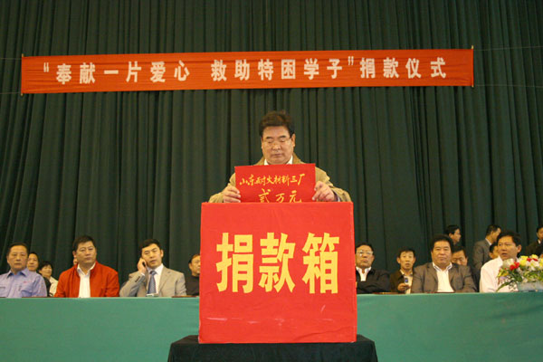 在举国上下喜迎党的十七大召开之际,我校于9月30号在校本部体育馆隆重举行“奉献一片爱心、救助特困学子”第十七次捐款仪式,学校爱心联谊会成员、领导班子成员在主席台就座,副校长张业玉讲话,工会主席孙希刚主持,3000余名师生参加。省、市、区电视台对此进行了专题采访。