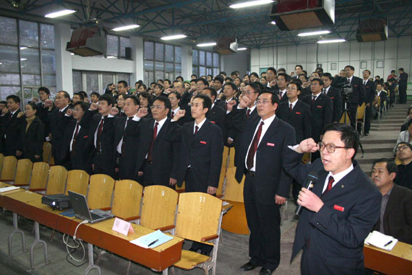 高雪长副校长代表学校宣读高2005级高考目标责任书。2008年高考总体目标是“夺双冠”,即进入全市前十名人数第一,本科上线及录取总人数全市第一;具体指标是:1、本科上线及录取总人数达到1200人。2、北大、清华录取总人数达到6人。3、重点本科上线达到400人。