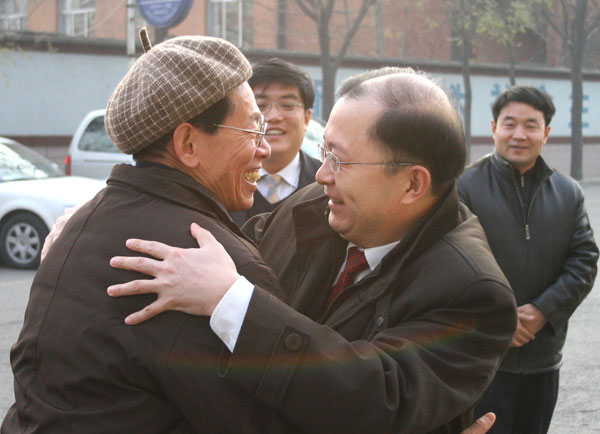 赵玉璞校友(右)与班主任由辛基老师深情拥抱