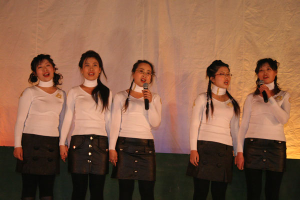 英语教研组17位年轻女教师集体演出的表演唱,使晚会达到了又一个高潮。身着靓装的老师们一出场,便引来同学们一片欢呼声,当演唱到《铿锵玫瑰》时,学生们纷纷上台为自已的老师每人献上一朵玫瑰,观众也都情不自禁地和着铿锵的节拍,沉浸在浓浓的师生情谊之中。
