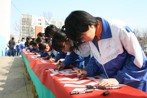 最后,伴随着《爱的奉献》乐曲,“顺意·善小”志愿者代表在印有“顺意,大爱无言;善小,立德修身”的条幅上庄重地签上自己的名字。
