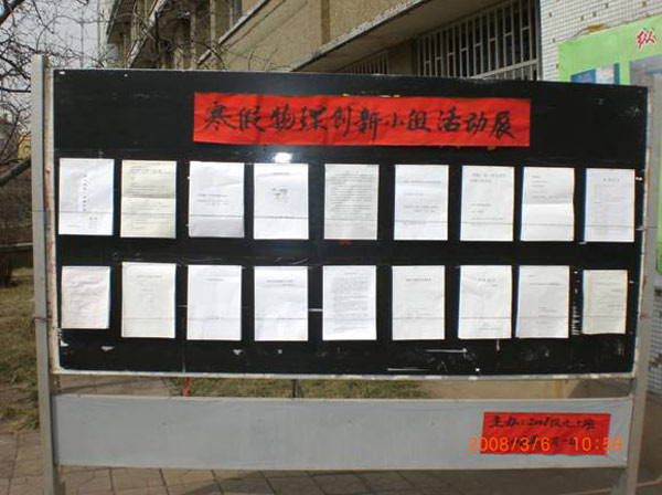 高2007级9班、10班寒假物理创新活动展 日期:2008-03-07 来源:本站 X 3月4日,高2007级9班、10班举办寒假物理创新活动暨寒假学生调查活动展览。 据此次活动的指导老师翟小铭老师介绍,此次活动参加人数达66人,分了21个兴趣小组,活动内容分发明创造类和调查研究类。此次展出的作品质量较高,彰显了我校学生的风采。 陈贞凯校长看到作品展后,特意为两班学生写来贺信,并鼓励他们全面发展,努力培养自身创造能力和动手能力,全面提升个人素质。