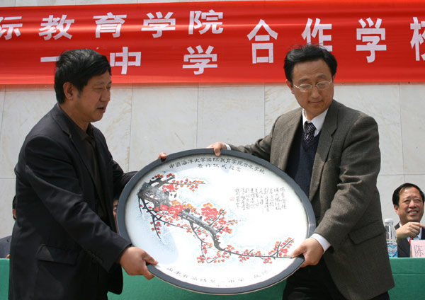 张业玉副校长(左)代表学校向中国海洋大学国际教育学院赠送纪念刻盘