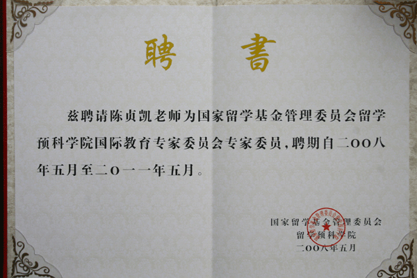近日传来喜讯,我校经过国家留学基金管理委员会留学预科学院考核鉴定,我校被选拔为“国家留学基金管理委员会留学预科学院出国人才选拔基地”,同时聘请陈贞凯校长担任国家留学基金管理委员会留学预科学院国际教育专家委员会专家委员。