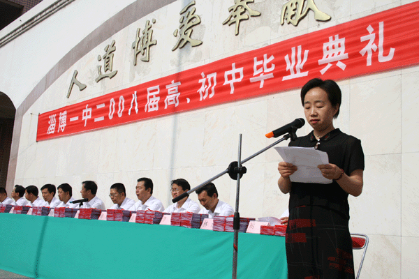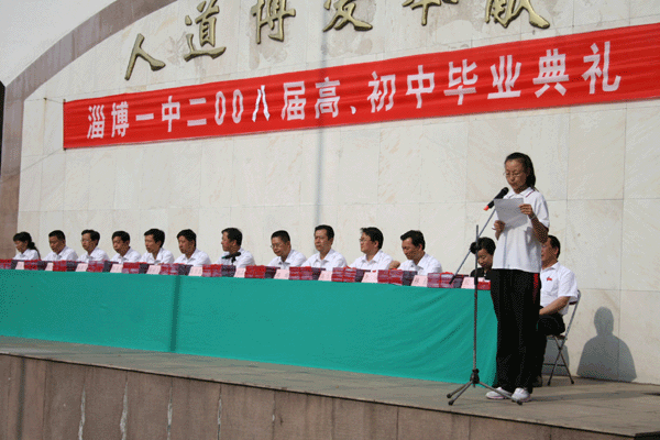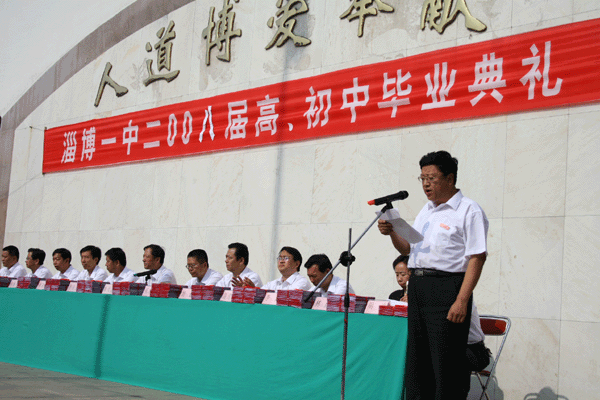 典礼在庄严的《中华人民共和国国歌》声中拉开帷幕,党委书记司志宏发表了热情洋溢的致辞,随后,初四学生代表苏晓塘同学,山东省优秀中学生、高三学生代表冯东明同学,学生家长代表——博山区国税局林红科长和教师代表——文科综合教研室主