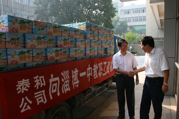 教师节前夕,淄博市第一医院、泰和实业公司、金晶玻璃集团、祥和集团股份有限公司等社会各界代表来到学校,送来了纪念礼品,向全校教职工祝贺节日。