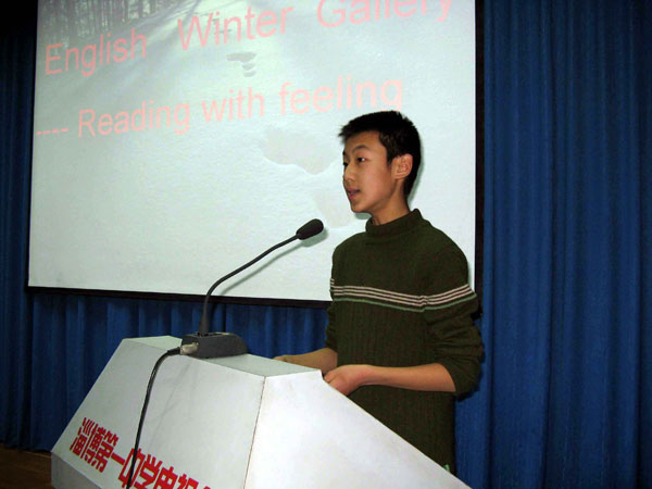 比赛分为四个环节:“英语之春---自我介绍”、“英语之夏---看图说话”、“英语之秋---英文金曲”、“英语之冬---佳篇诵读”。每个班派出四名同学代表本班参赛。富有创意的同学们将简单的自我介绍赋予了一定的场景,令人耳目一新。现场抽题的看图说话显示了同学们丰富的想象力与现场组织语言的能力。曲曲动感的英文金曲更是花季男女同学的强项,动听的旋律,优美的舞姿尽展少年的活力。对英文名篇的配乐朗诵让我们领略了外国文学的魅力,激昂的《I have a dream》,伤感的英文版《再别康桥》,朗诵者们标准的语音语调与纯净悠扬的经典钢琴曲完美地揉和在一起,让在场的评委老师和同学们不禁为之动容。