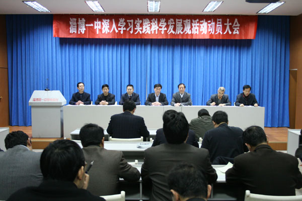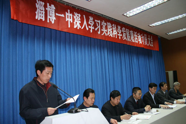 会议由陈贞凯校长主持,副校长张业玉宣读《中共淄博一中委员会关于开展深入学习实践科学发展观活动的实施方案》,纪委书记刘诚宣读《中共淄博一中委员会关于成立深入学习实践科学发展观活动领导小组、办公室及职能小组的通知》,工会主席孙希刚宣读《淄博一中深入学习实践科学发展观活动宣传方案》。