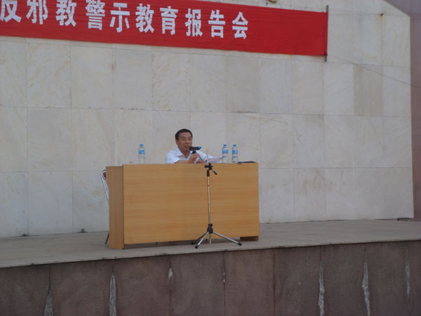 为了进一步提高广大师生对“法轮功”等邪教组织的识别、抵制能力,5月13日下午,我校在博爱广场举办反邪教警示教育报告会。市委610办公室由少华主任、张亮科长,在市教育局组织人事科李效同副科长等的陪同下,来校做专题报告。报告会由校长助理吕永军主持,初中一至三年级1000余名师生听取了报告。