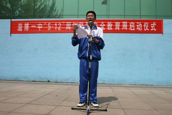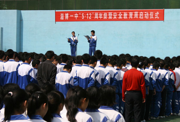 5月12的升旗礼上,淄博一中“5.12汶川地震周年祭”拉开了一系列活动的序幕,一首深切纪念地震死难者的的长诗,再一次深深震撼了每一个学生的心灵,鼓起了每一位学子“珍爱生命,从现在做起”的信心和激情。学生校长助理、团委会、学生会联合向全校师生发出的“珍爱生命,让人生的价值在奋斗中升华”的倡议书,表达了一中学生珍爱生命、尊重生命、提高生命质量,实现人生价值,从自身做起,从小事做起,学会关心自我、关心他人、关心自然、关心社会的决心。